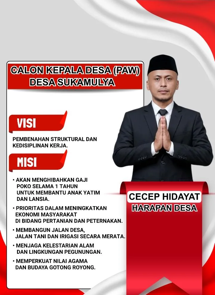 Adalah Cecep Hidayat, putra asli daerah, yang dengan penuh kesadaran dan tanggung jawab menyatakan siap maju sebagai calon Kepala Desa Sukamulya.