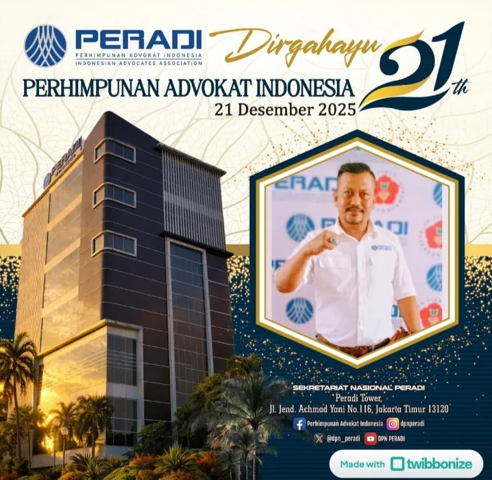 Garut, 21/12/2025,Genap 21 tahun usia Perhimpunan Advokat Indonesia (Peradi) menjadi momentum penting untuk melakukan refleksi mendalam atas perjalanan, peran, dan tanggung jawab organisasi advokat terbesar di Indonesia ini. Dua puluh satu tahun bukan sekadar angka, melainkan penanda kedewasaan organisasi yang lahir dari semangat persatuan, integritas, dan pengabdian terhadap penegakan hukum serta keadilan. Dalam perjalanan panjang tersebut, Peradi terus berupaya menjaga marwah profesi advokat sebagai salah satu pilar penegak hukum yang sejajar dengan hakim, jaksa, dan aparat penegak hukum lainnya.