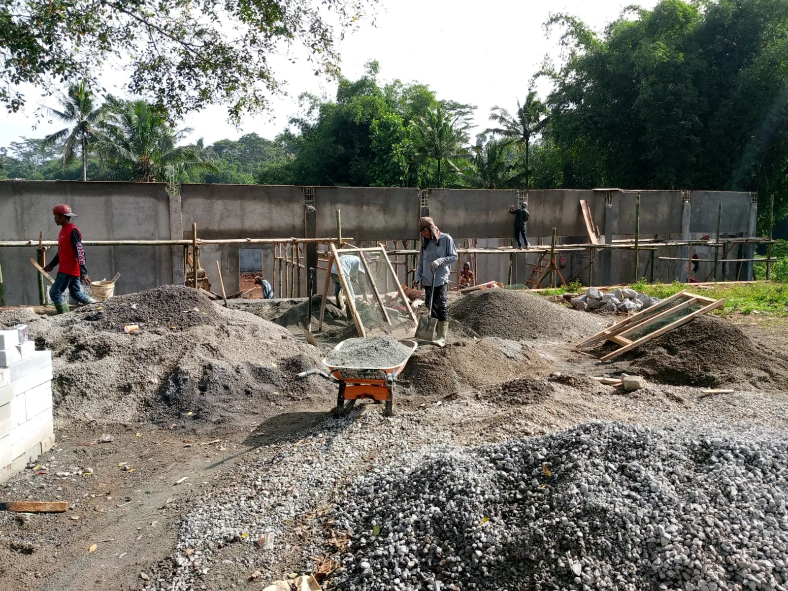 Pantauan di lokasi menunjukkan aktivitas pembangunan berjalan dengan lancar. Para pekerja tampak sibuk mengolah material bangunan seperti pasir, batu, dan batako, sementara struktur tembok gedung mulai berdiri kokoh.