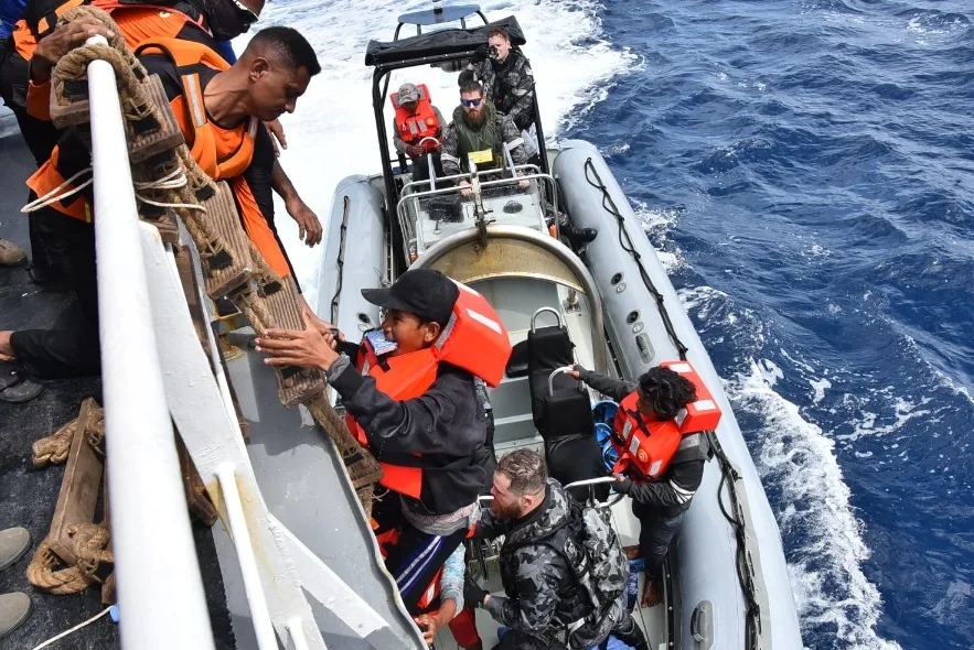WARTABELANEGARA.COM, TIMOR — Bakamla RI melalui unsur KN. Pulau Nipah-321 bersama KP. Orca 01 milik Ditjen Pengawasan Sumberdaya Kelautan dan Perikanan (PSDKP) berhasil evakuasi korban kecelakaan 2 kapal di Laut Timor, Rabu (24/5/2023).