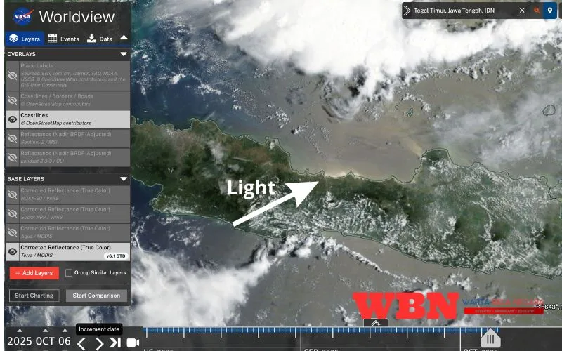 Analisis terbaru menunjukkan perbedaan citra satelit NASA Worldview antara tanggal 5 dan 6 Oktober 2025, di mana titik terang muncul di sekitar Pantai Purwahamba Indah, Pantai Alam Indah, Pantai Larangan, hingga area Pemancingan Megalodon, Tegal. Citra pada tanggal 5 Oktober tidak memperlihatkan kilatan cahaya tersebut, namun keesokan harinya — 6 Oktober 2025 — muncul anomali reflektansi cahaya di koordinat yang sama. Pada tanggal 7 dan 8 Oktober, titik terang itu kembali hilang.