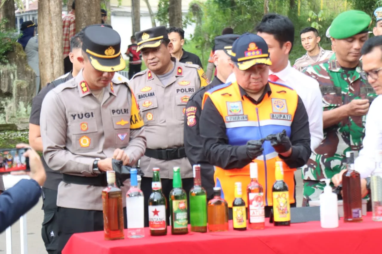 Kapolres Garut AKBP Yugi Bayu Hendarto menyampaikan bahwa dalam kegiatan tersebut pihaknya memusnahkan sebanyak 1.852 botol minuman keras berbagai merek serta 704 knalpot brong hasil penindakan di lapangan.