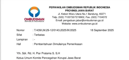 Kasus dugaan maladministrasi terkait lahan yang digunakan untuk pembangunan Gedung Sarana dan Prasarana (Sarpras) UPTD Dinas PUTR Kabupaten Bandung di Rancakasumba, Kecamatan Solokan Jeruk, kini memasuki babak baru. Setelah sebelumnya menjadi temuan Komite Pencegahan Korupsi Jawa Barat (KPK Jabar) dan DPRD Kabupaten Bandung, persoalan ini kini tengah diperiksa oleh Ombudsman Republik Indonesia sejak 18 September 2025.