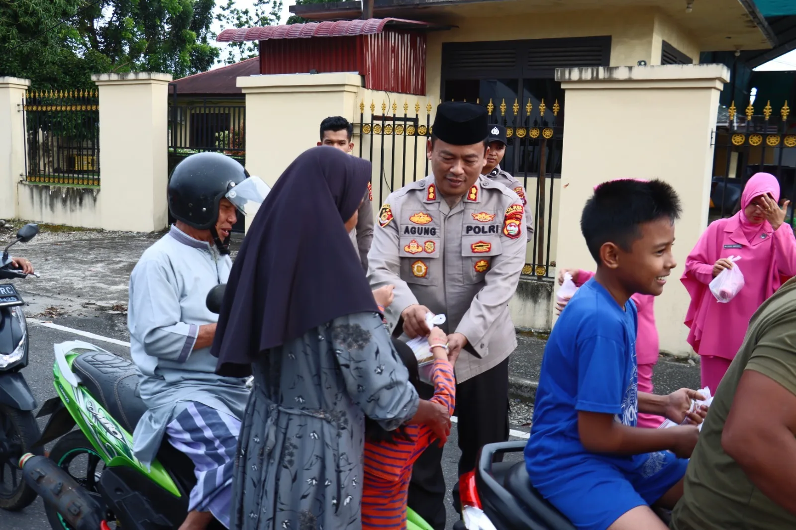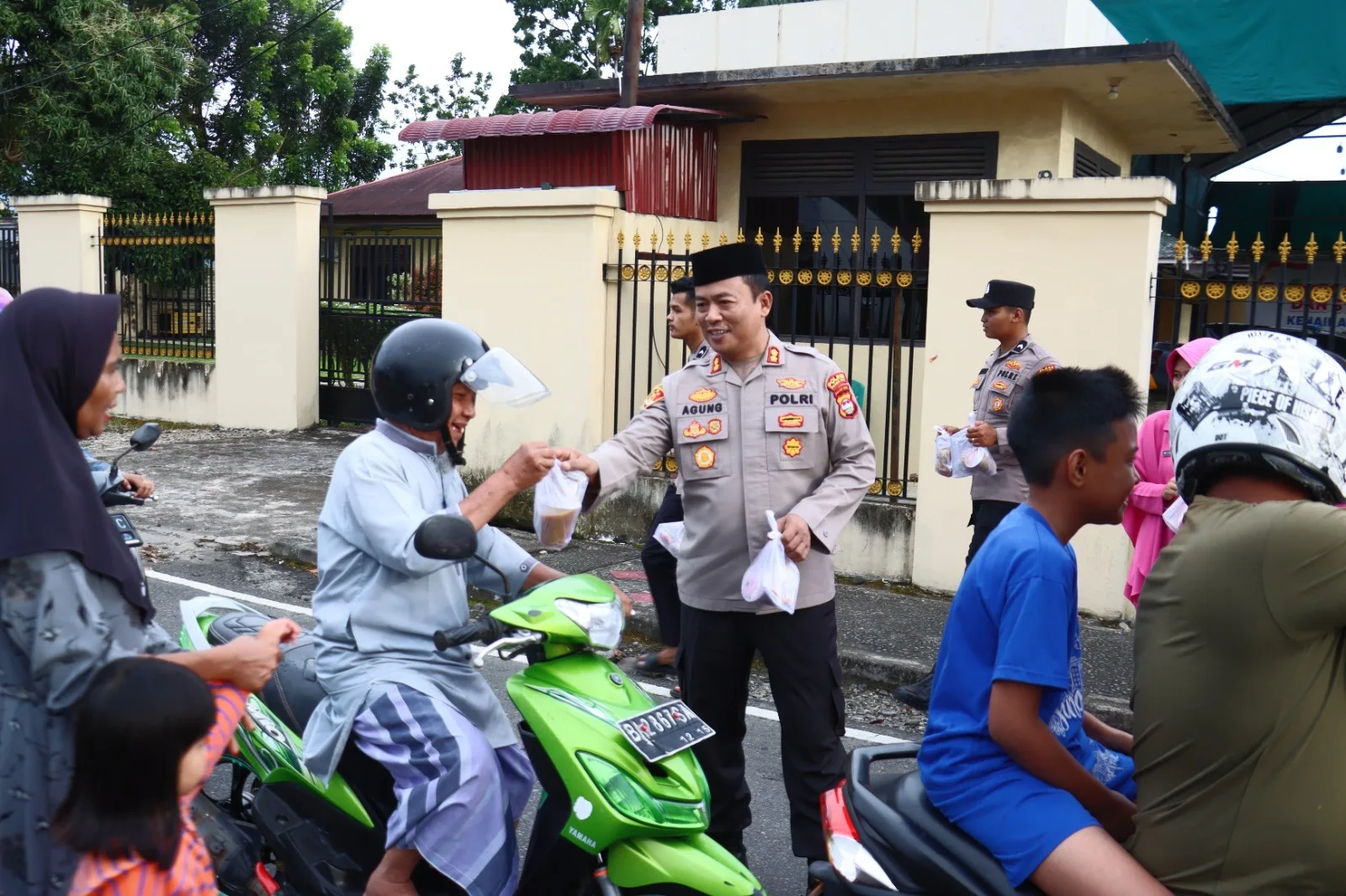 Para personel Kepolisian bersama Bhayangkari terlihat membagikan paket takjil secara humanis kepada para pengendara yang melintas, baik pengendara roda dua, roda empat hingga kendaraan angkutan barang. Dengan penuh keakraban, para personel menyapa dan memberikan takjil kepada para pengendara sebagai bekal untuk berbuka puasa.