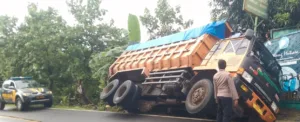 Akibatnya, kendaraan Fuso kehilangan kendali dan terperosok ke parit di sisi kiri jalan. Beruntung, tidak dilaporkan adanya korban jiwa dalam insiden tersebut.