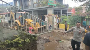 Garut | Polsek Cisurupan Polres Garut bersama BPBD, Damkar, TNI, POLRI, serta Forkopimcam Cisurupan dibantu warga sekitar melaksanakan evakuasi material bekas banjir dan longsor di Kampung Pasar Kaler, Desa Balewangi, Kecamatan Cisurupan, Kabupaten Garut.