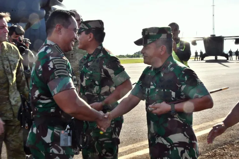 WBN , Dabo Singkep – Panglima Kodam (Pangdam) I/ Bukit Barisan Mayjen TNI Ahmad Daniel Chardien, S.E. M.Si., bersama Danrem 033/Wira Pratama Brigjen TNI Yudi Yulistyanto, M.A. M.Si., menyambut kedatangan Panglima TNI Jendral TNI Andika Perkasa dalam rangka Kunker latihan serbuan pendaratan Amfibi bersandi “Ausindo Amphibious Assault Exercise”. Latihan yang digelar dari tanggal 19 – 20 November 2022 di wilayah perairan Dabo Singkep, Kepulauan Riau. Minggu(20/11/2022).