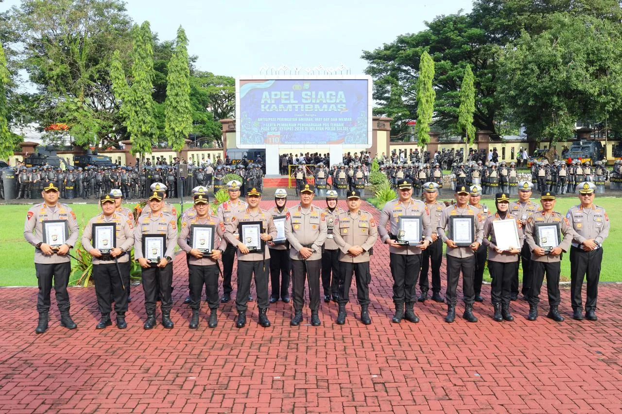 Wartabelanegara.com,Sulsel–Kapolda Sulawesi Selatan Irjen Pol. Djuhandhani Rahardjo Puro, S.H., M.H., menyerahkan penghargaan kepada jajaran Polres atas capaian kinerja dalam pelaksanaan Operasi Ketupat 2026. Kegiatan tersebut berlangsung di Lapangan Upacara Mapolda Sulsel, Senin (30/03/2026).