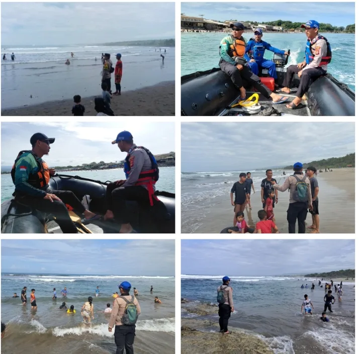 Personel Sat Polairud terlihat menyisir area pantai, menyapa para pengunjung, serta mengingatkan agar tidak berenang terlalu ke tengah dan selalu memperhatikan kondisi cuaca serta gelombang laut yang dapat berubah sewaktu-waktu.